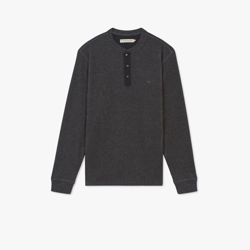 The Croyden henley is an essential style for year-round dressing. Cut in a regular fit from waffle knit cotton blend jersey, this easy wearing style is finished with ribbed cuffs, a quarter button placket and signature, tonal longhorn embroidery on the chest. Pair it with your favourite jeans for relaxed, effortless look.