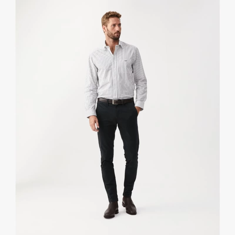Constructed in an 8.7oz stretch twill, the Lincoln Chino is a slim fit that sits below the waist, logo buttons, angled front pockets, fob pocket, back hip jet pockets, signature Longhorn embroidery above back hip pocket