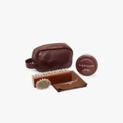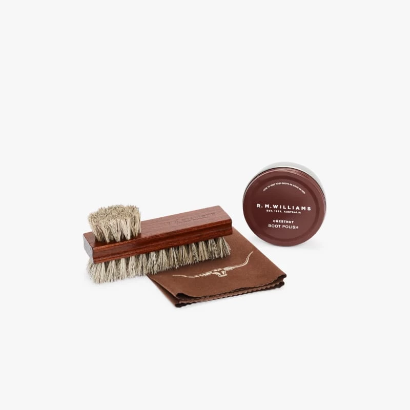 Keep your collection of R.M.Williams boots well cared for with the Mini Travel Care Kit. The Kit comes in a full grain leather mini travel bag with R.M.Williams script logo debossing and includes Double Sided Polish Brush, Stockmans boot Polish and a polish cloth.
